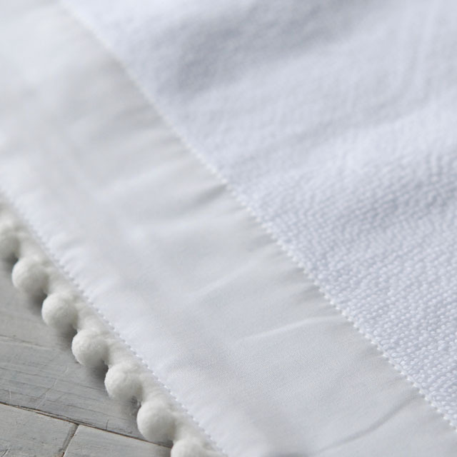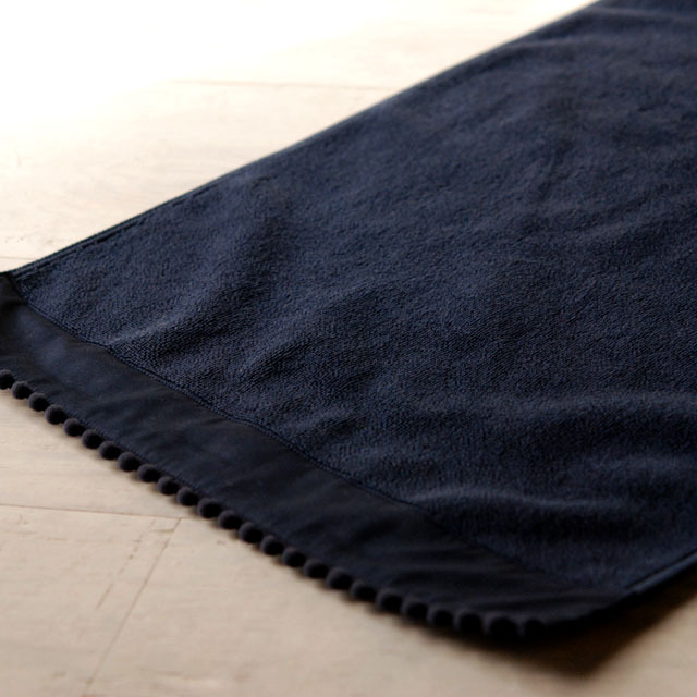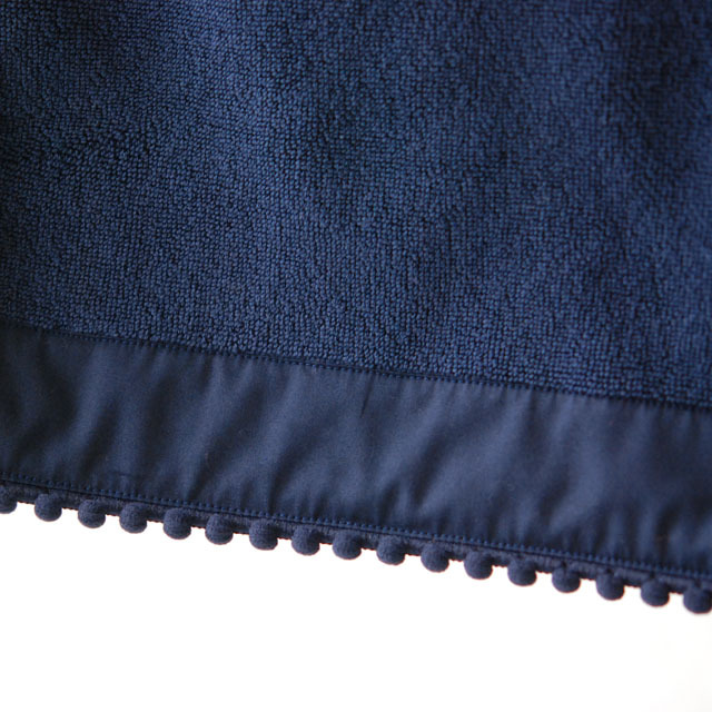 ネイビーと白の配色のタオルにあしらったボンテンブレードが可愛くなりすぎず、ラグジュアリーな仕上がりとなっています。