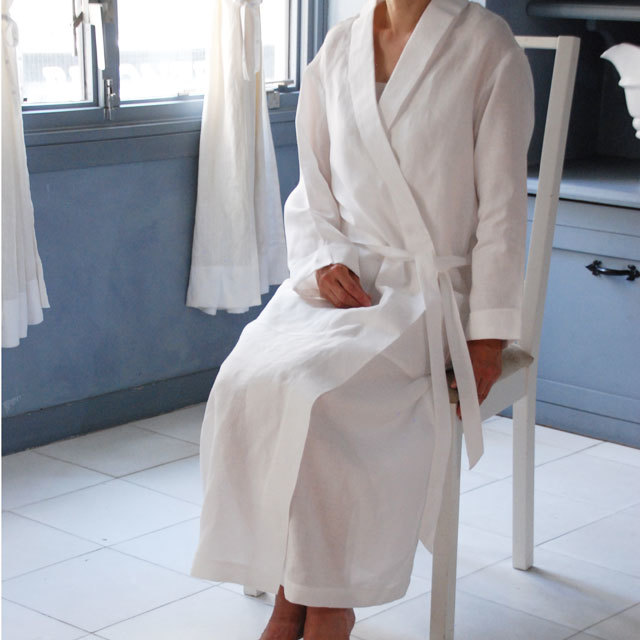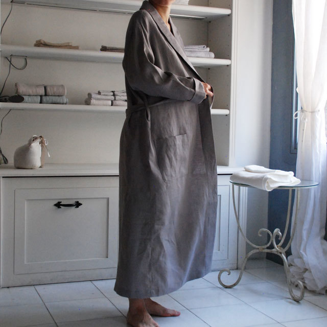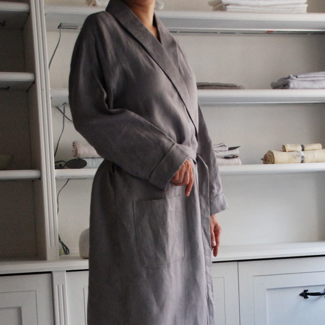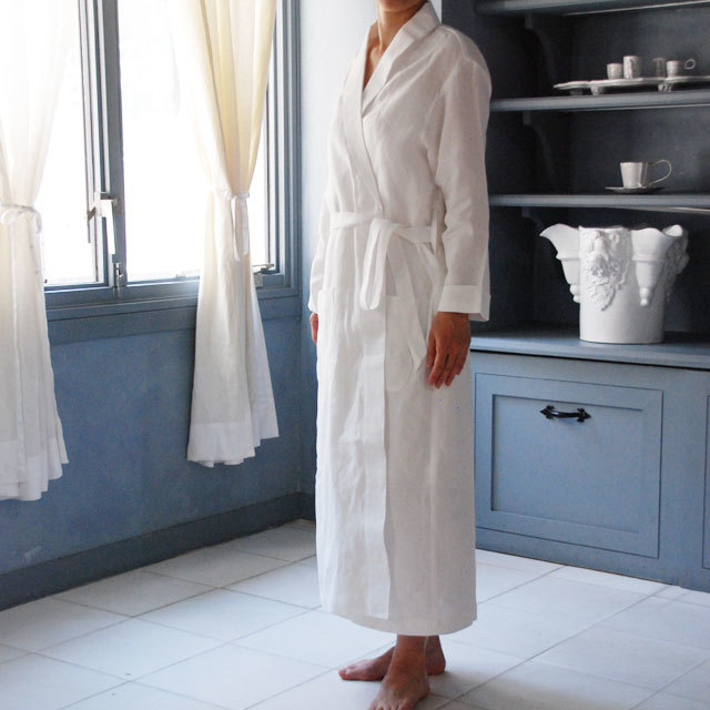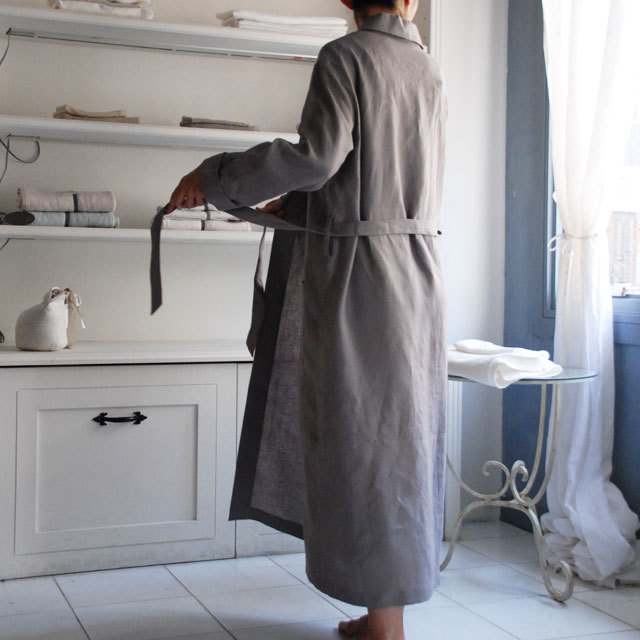 衿のカーブラインや細めのベルトなどディテールにこだわったエレガントな印象のローブ。