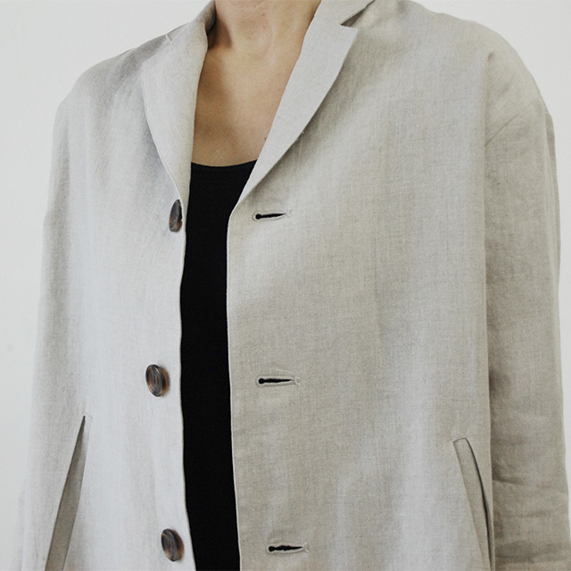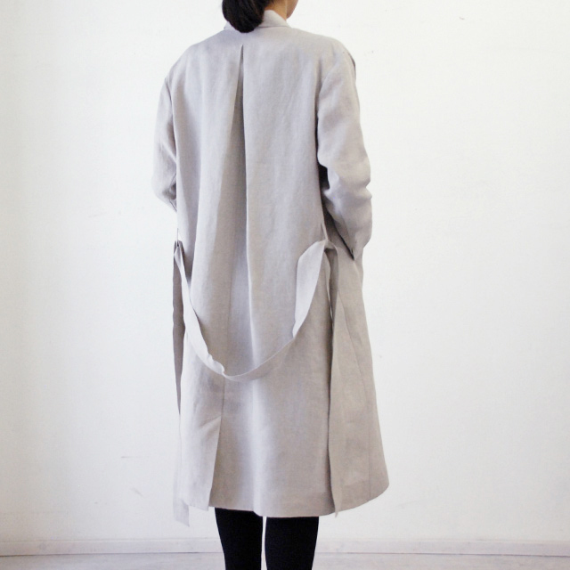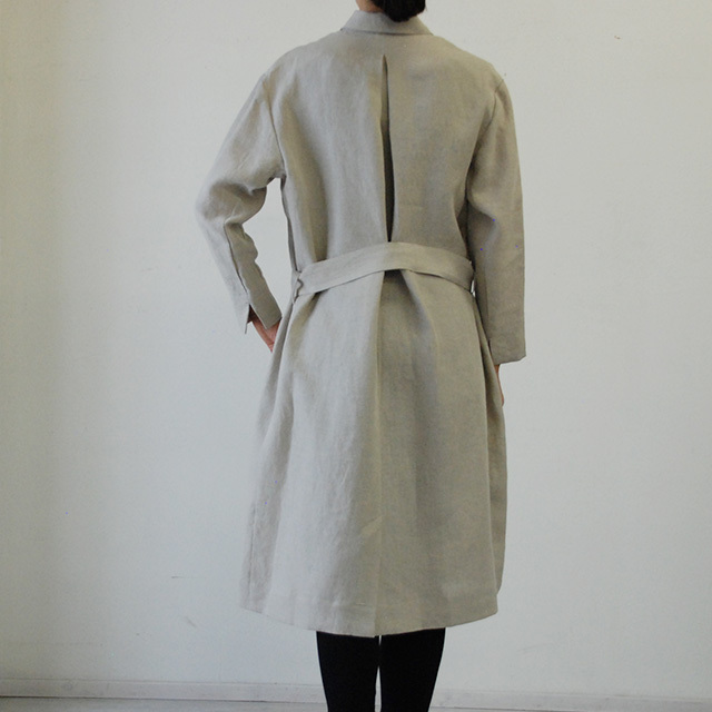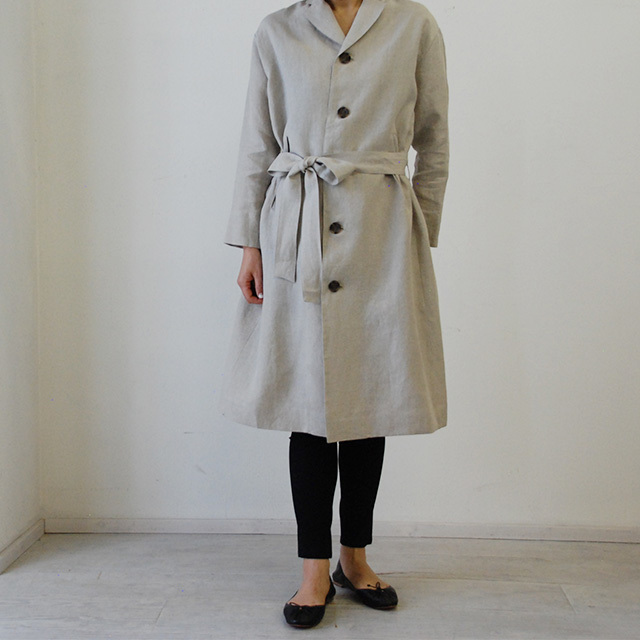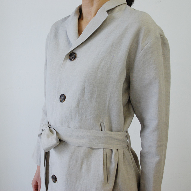 春先や秋口の羽織ものとして、Tシャツなどの上からさらっと羽織っていただいても素敵ですし、共布のベルトを後ろで結んだり、またボタンを留めたウエストマークのスタイルもお楽しみいただけます。