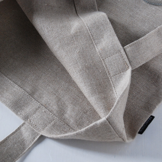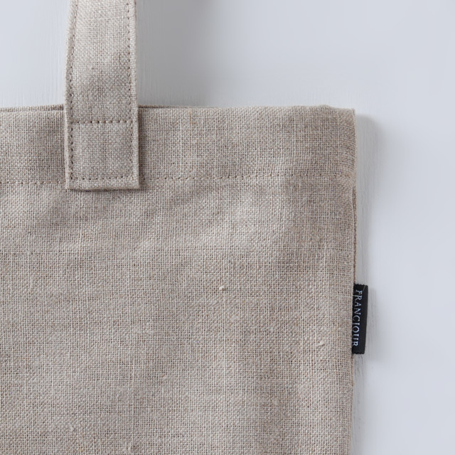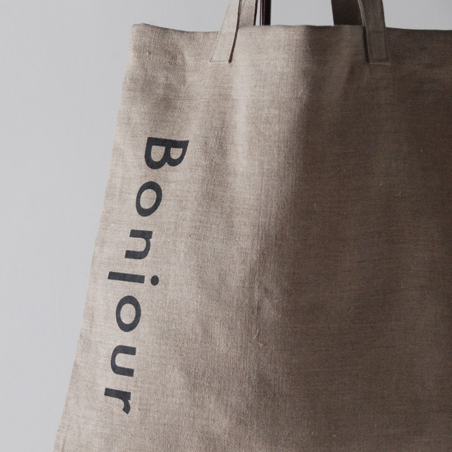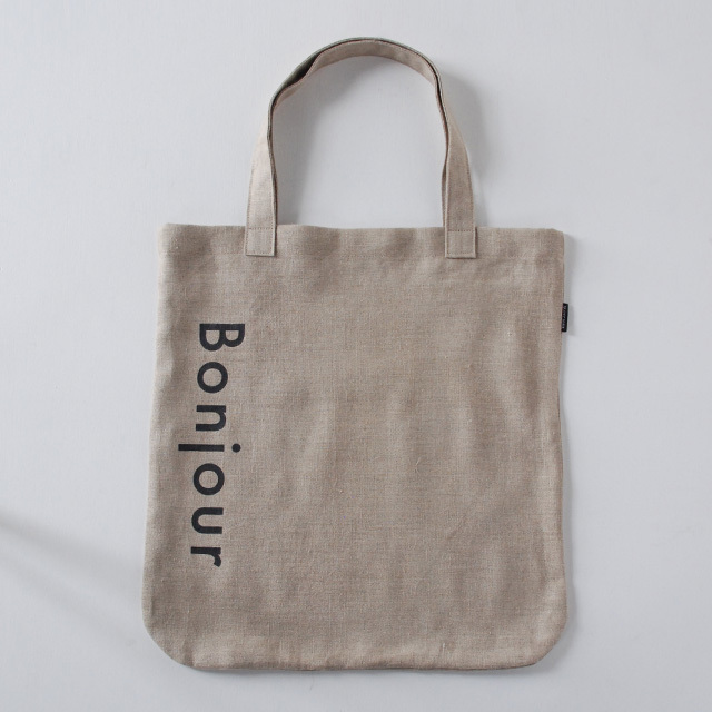 リネン生地に「BONJOUR」のロゴをサイドに入れたシンプルなデザインのエコバッグ。