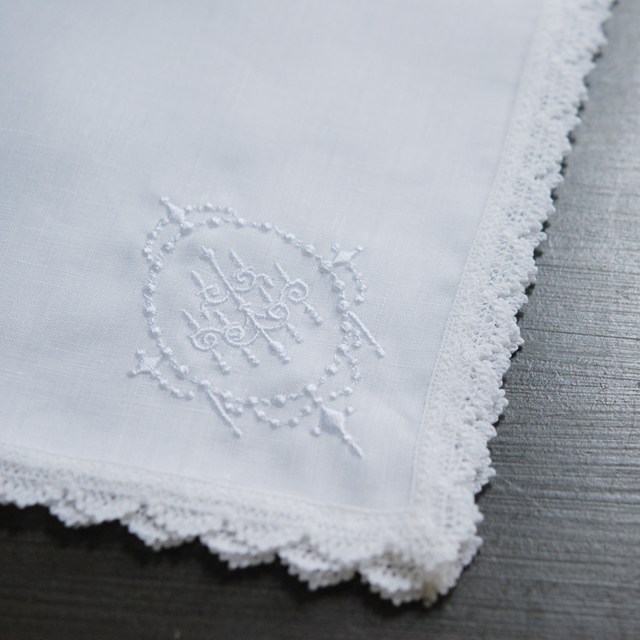 シャンデリアの刺繍が入った、繊細でエレガントな表情のハンカチです。