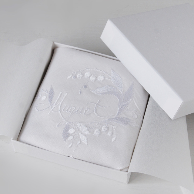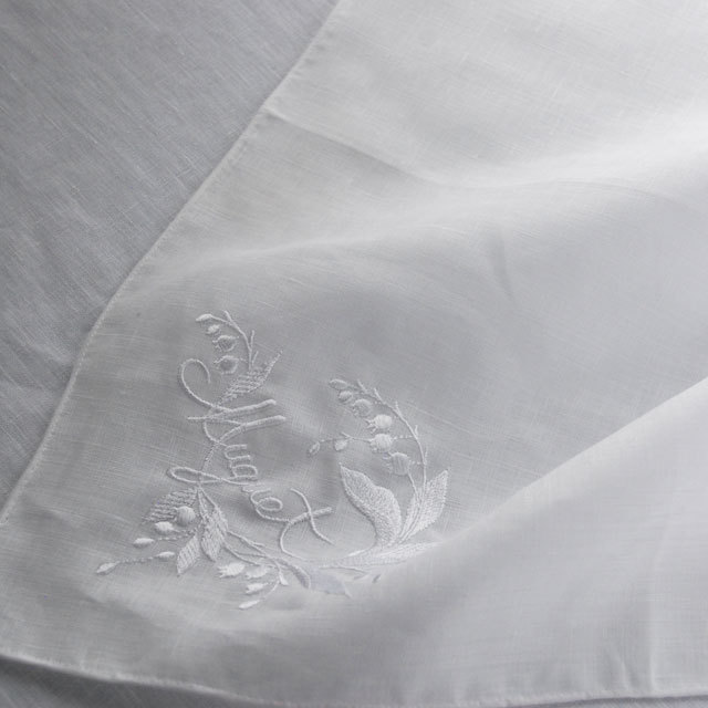 MUGUET = すずらん。真っ白のすずらんの刺繍が優しい雰囲気のハンカチは、持っているだけで心が穏やかになれそうです。