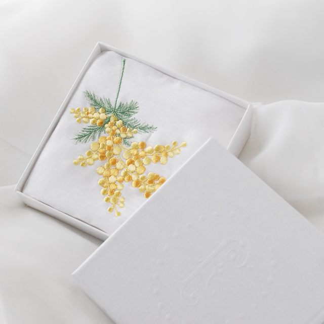 真っ白の生地にミモザの刺繍が映え、華やかな雰囲気です。