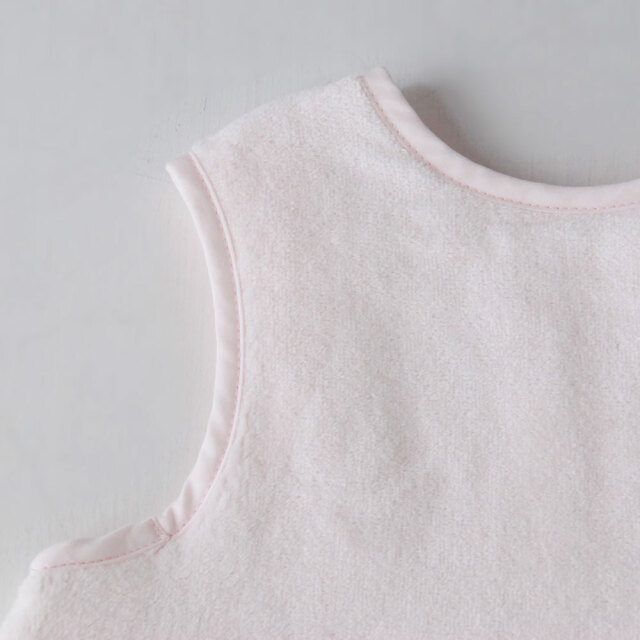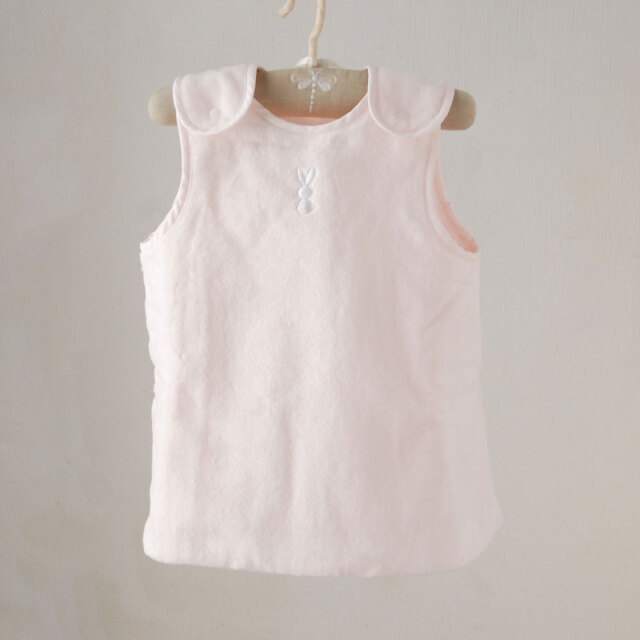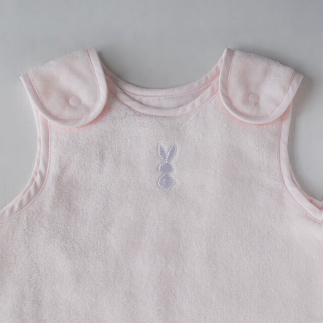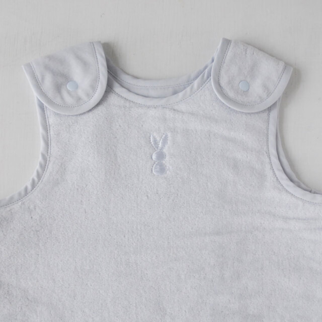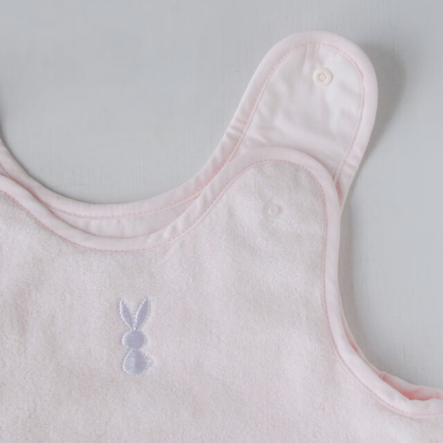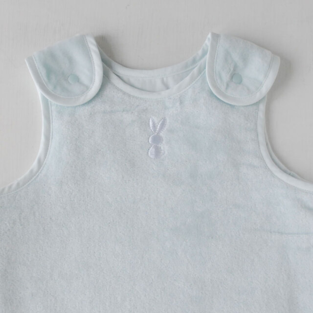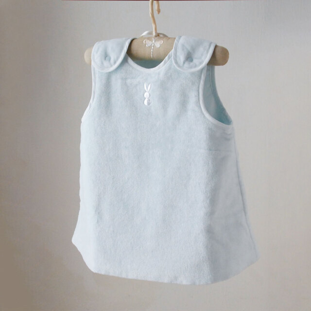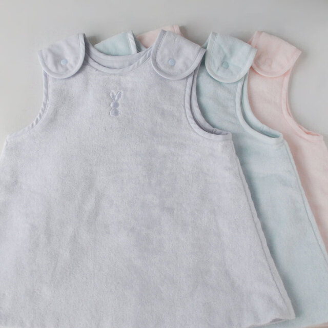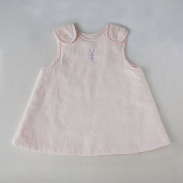 シンプルなうさぎの刺繍がワンポイントのエプロンドレスです。優しい風合いのシャーリングタオルにアームホールや衿ぐりにブロードのパイピング始末で仕上げたお食事用エプロンです。お食事はもちろんお出かけにも着られる上品なデザイン。