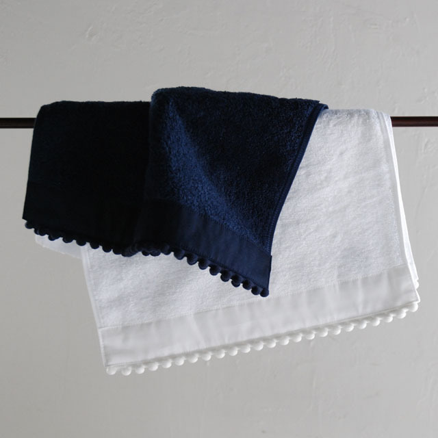 ネイビーと白の配色のタオルにあしらったボンテンブレードが可愛くなりすぎず、ラグジュアリーな仕上がりとなっています。
