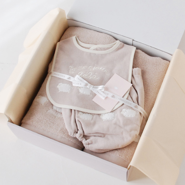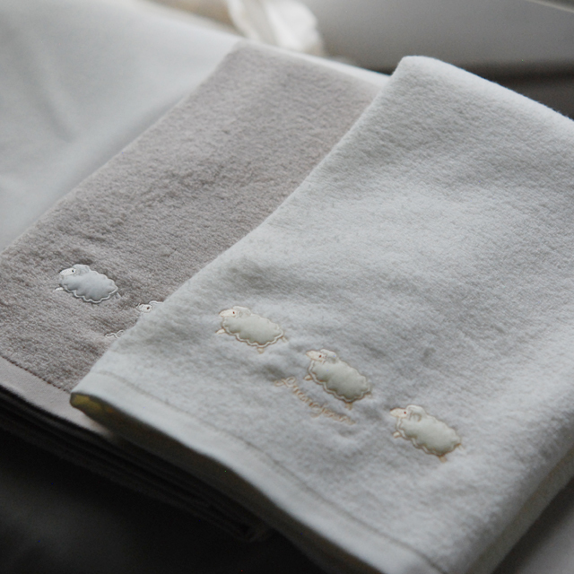 ひつじのアップリケ刺繍が施されたミニョンシリーズ。 色使いが優しく、可愛い赤ちゃんにぴったりのシリーズです。