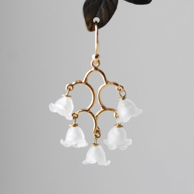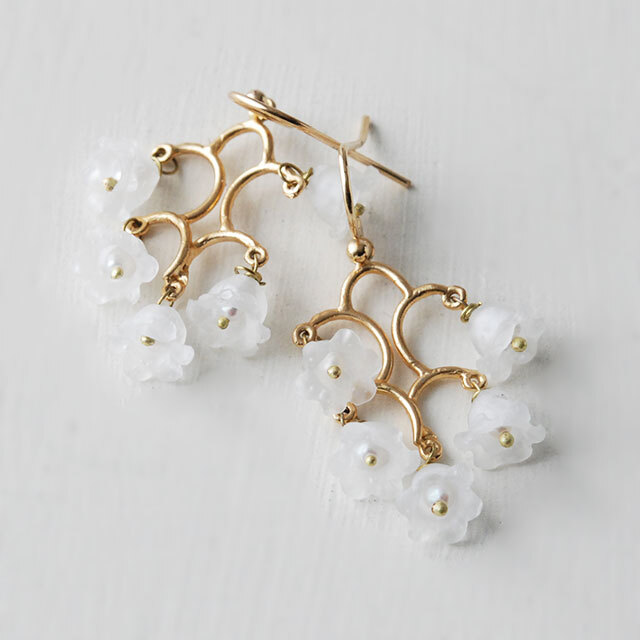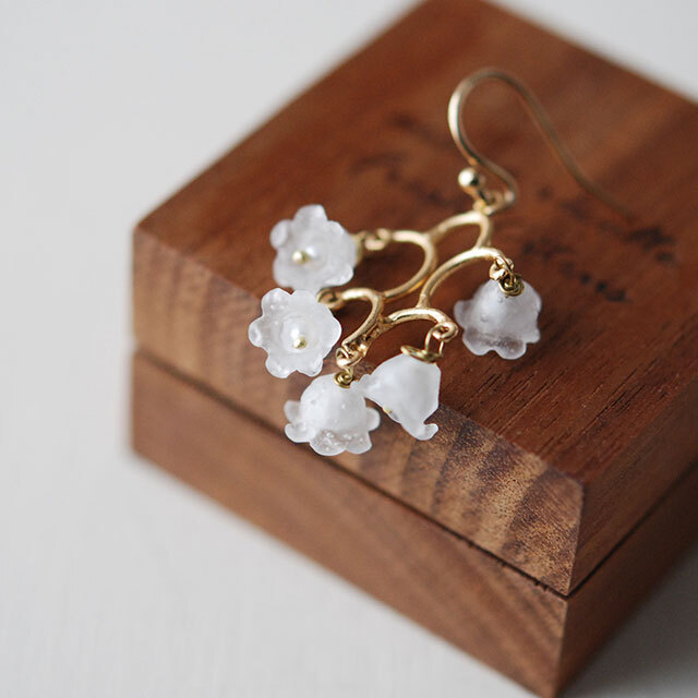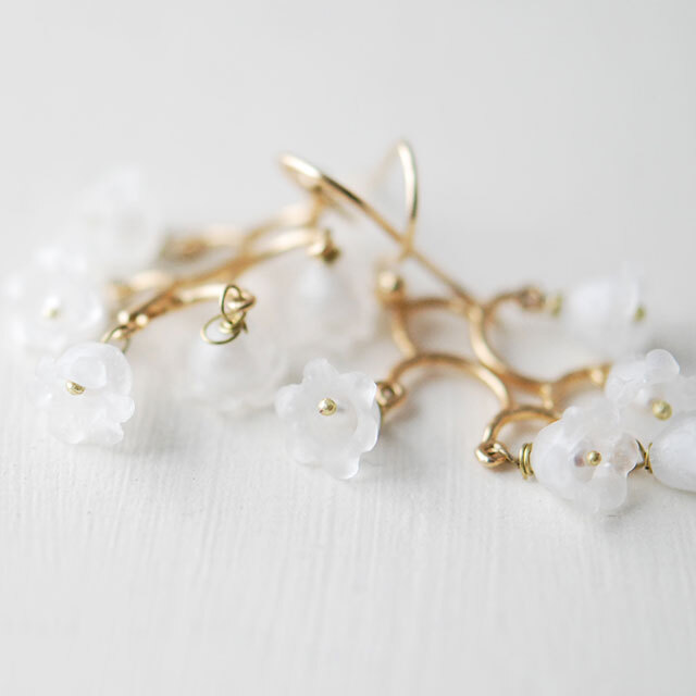 一つ一つのガラスの花に白の淡水パールを埋め込んでいます。
