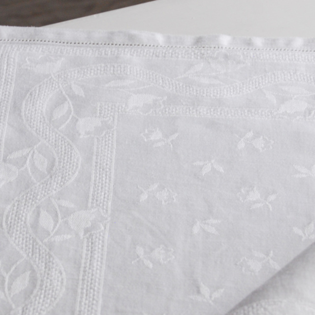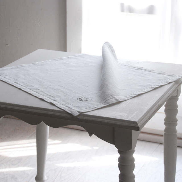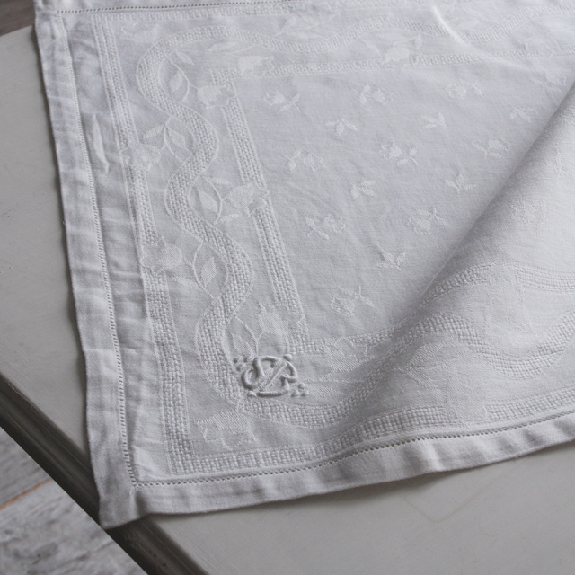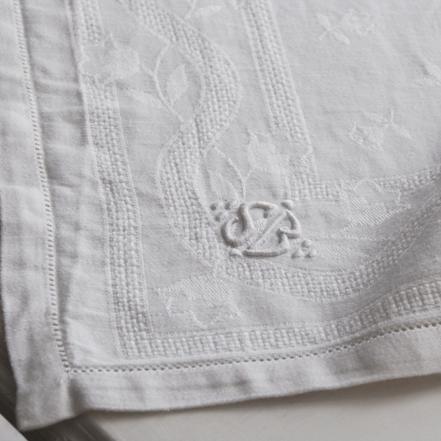 コットンのダマスク織ナプキン。角一箇所にサテンステッチでモノグラム刺繍が入っています。