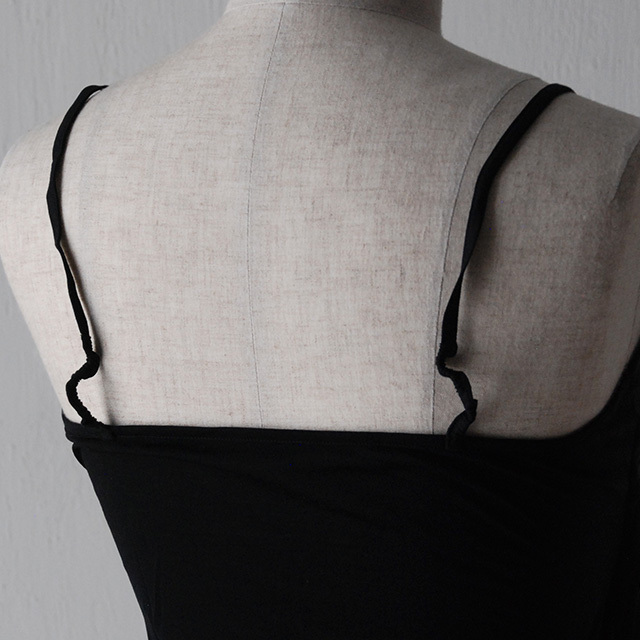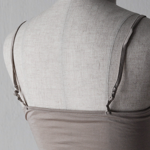 *ストラップは本体と共布のシルク素材です。金具のアジャスターをなくし、ストラップの内部にコールゴムをいれました。ストラップは本体の外側に縫製し、肌へのあたりを軽減しました。