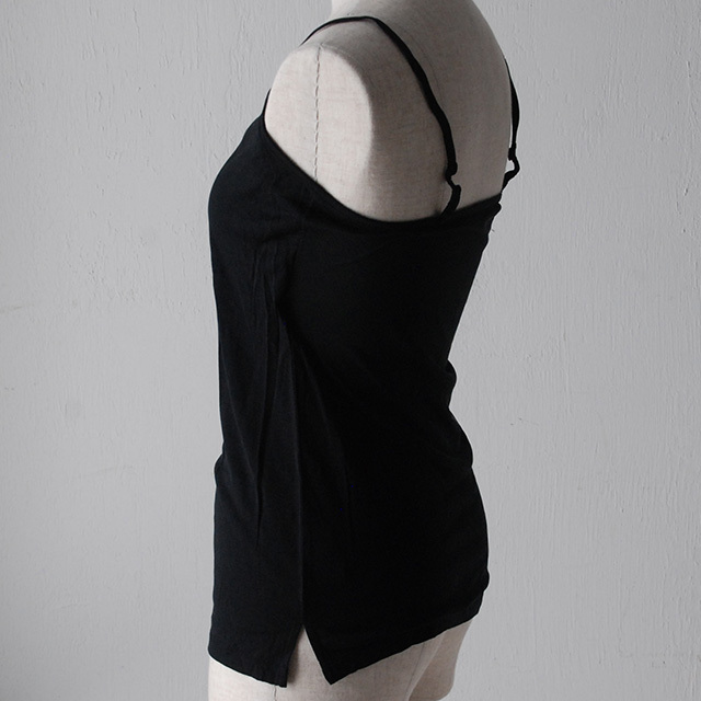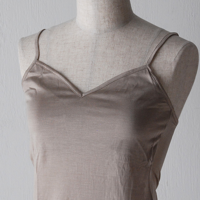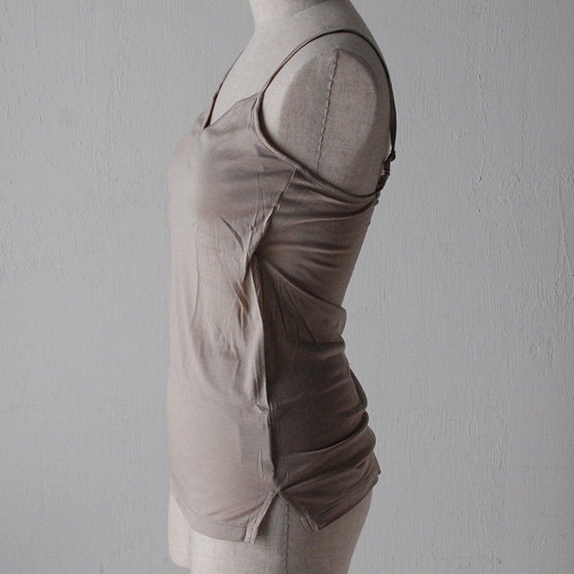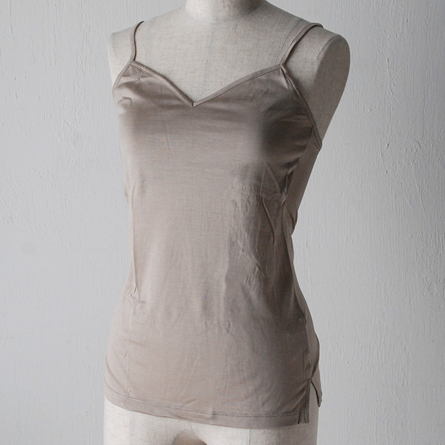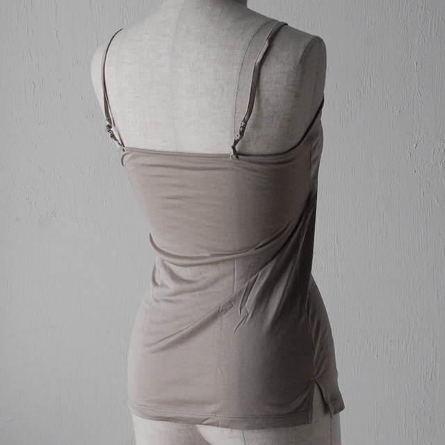 前見ごろに取り外し可能なパッドをいれ、背中は一枚布でアンダーゴムの窮屈感がありません。一枚でブラジャーとキャミソールを兼ね、薄着でもバストの形やブラジャーのラインが透けることが気になりません。パッドを外せばキャミソールとして、お持ちのブラジャーとあわせても。インナーとしてはもちろん、部屋着やパジャマの下に着たりと、重宝します。ナチュラルな見た目と着用感が特徴で、バストのホールド力は低めです。