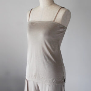 前見ごろに取り外し可能なパッドをいれ、背中は一枚布でアンダーゴムの窮屈感がありません。一枚でブラジャーとキャミソールを兼ね、薄着でもバストの形やブラジャーのラインが透けることが気になりません。パッドを外せばキャミソールとして、お持ちのブラジャーとあわせても。インナーとしてはもちろん、部屋着やパジャマの下に着たりと、重宝します。ナチュラルな見た目と着用感が特徴で、バストのホールド力は低めです。