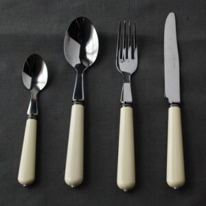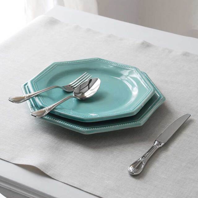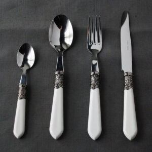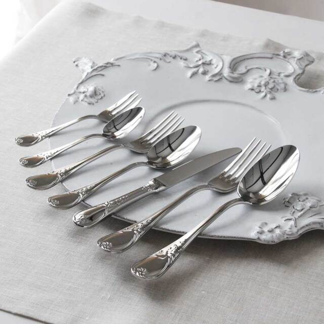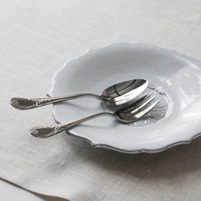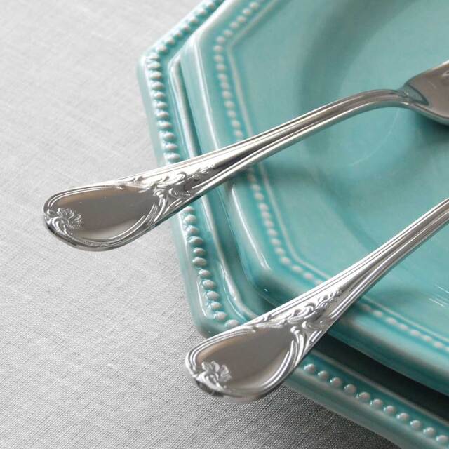 フォーク、スプーンなどのカトラリーは繊細な細工が施され、食卓を美しく彩ります。