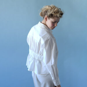 前のふらしラペル、後ろのふらしヨーク、ギャザーディテイルなどで前・横・後からのシルエットにこだわった商品です。