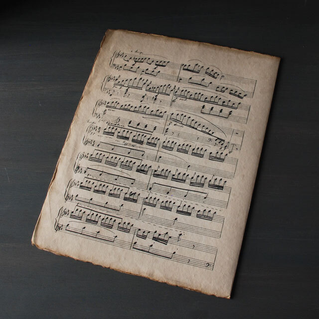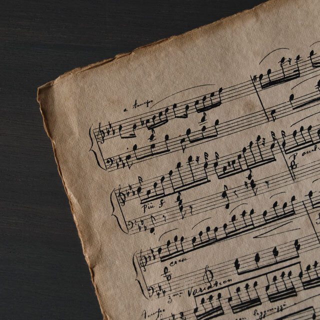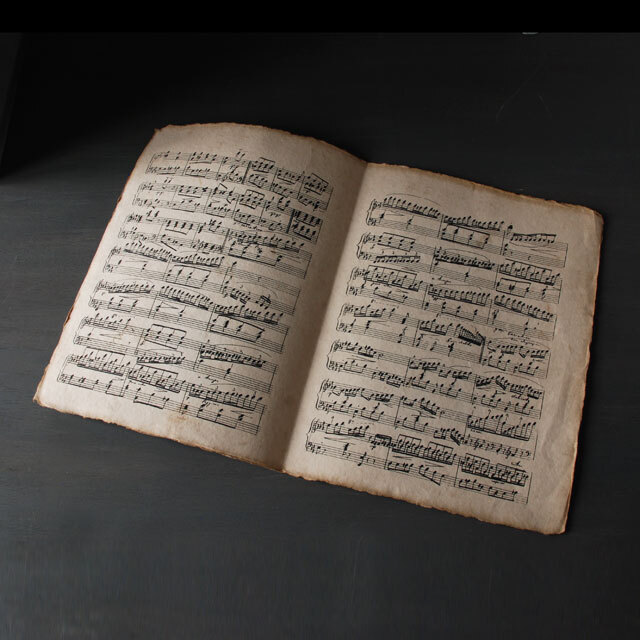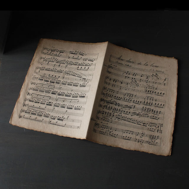 味わいのある紙にプリントされた楽譜。付属のリボンでくるんでお部屋のインテリアに。