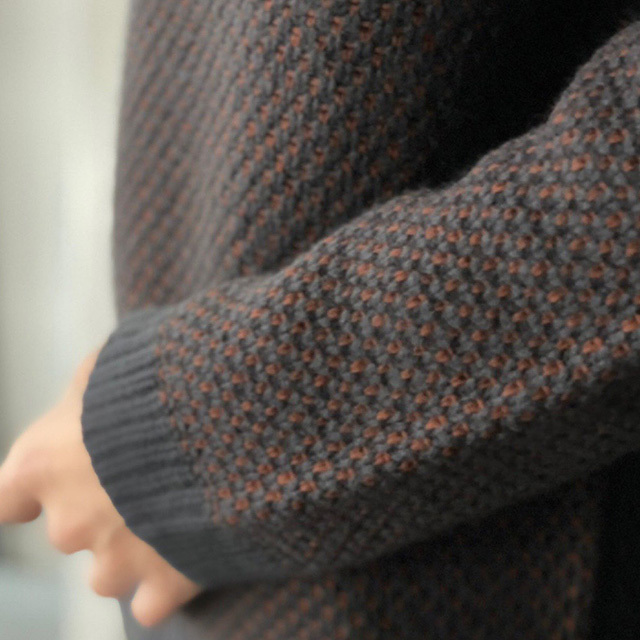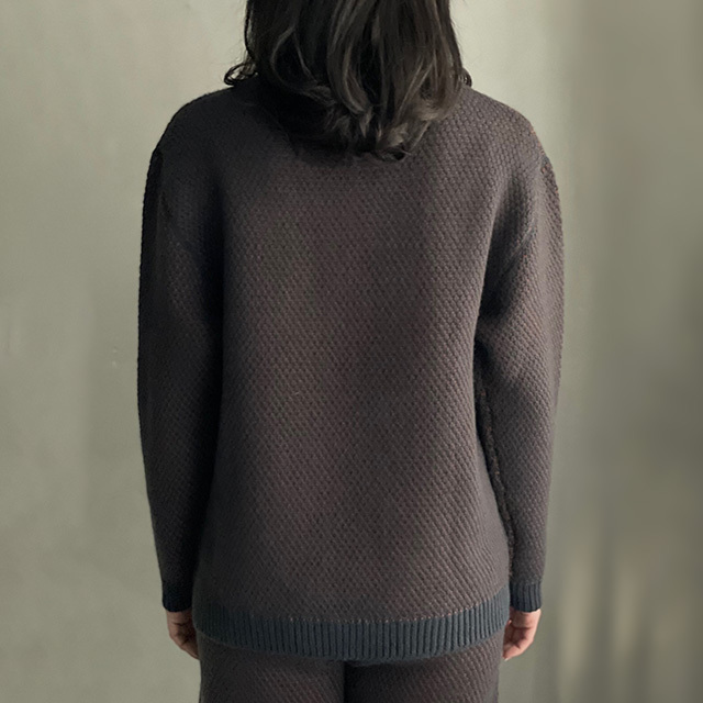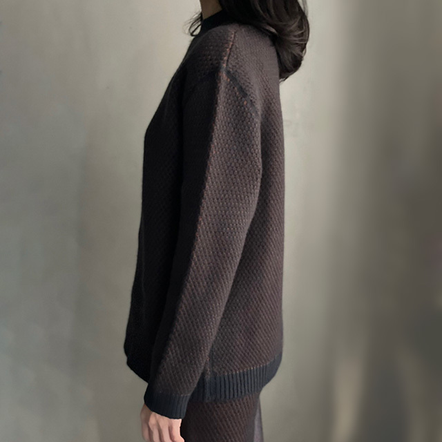 ドロップショルダーのゆったりとしたセーター。アッシュとブラウン2色の糸でダイヤモンド柄に編まれています。MARTAとセットで着用できます。