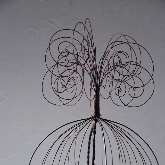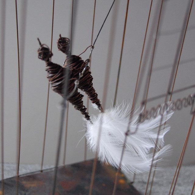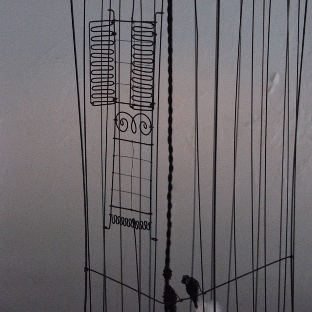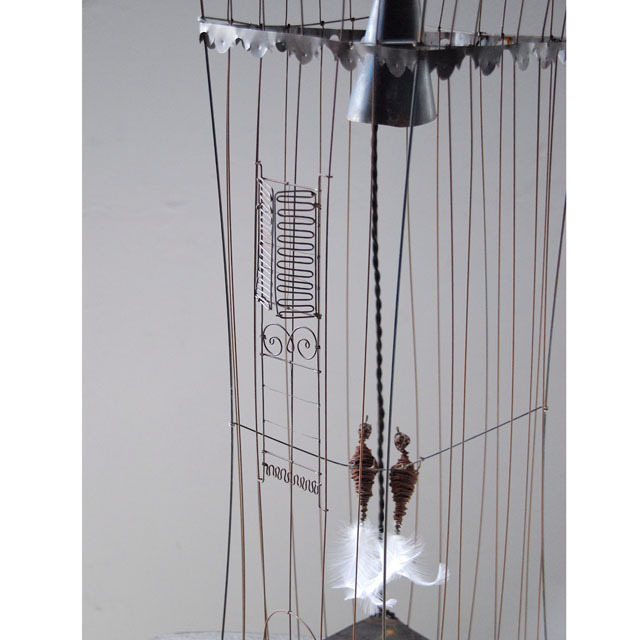 繊細なワイヤーワークの 鳥かご。 しっぽには アンティーク生地が 使われています。 ついじっと 見つめていたくなる 愛らしい作品です。仲良く並ぶ2羽の鳥たちは、楽しくおしゃべりをしているかのよう。 かごの中のライトが、鳥たちを優しく灯します。
