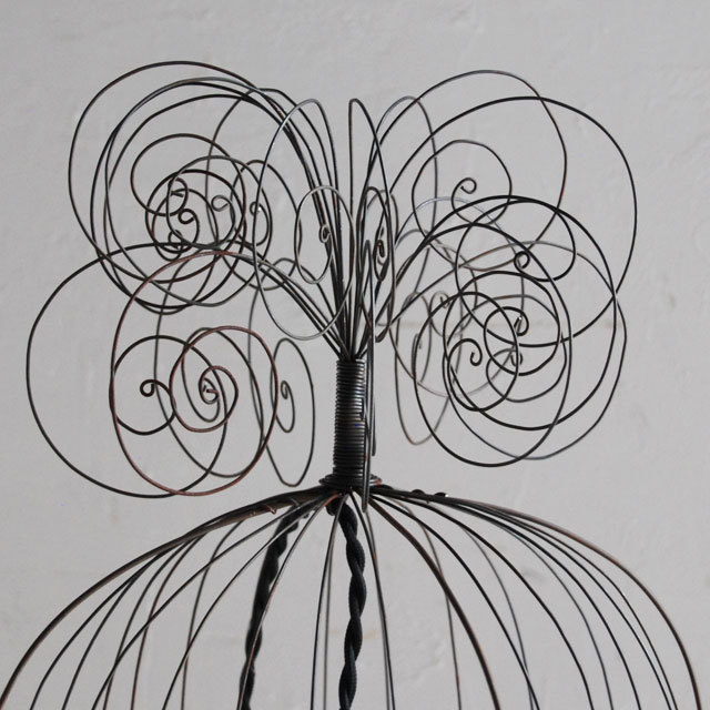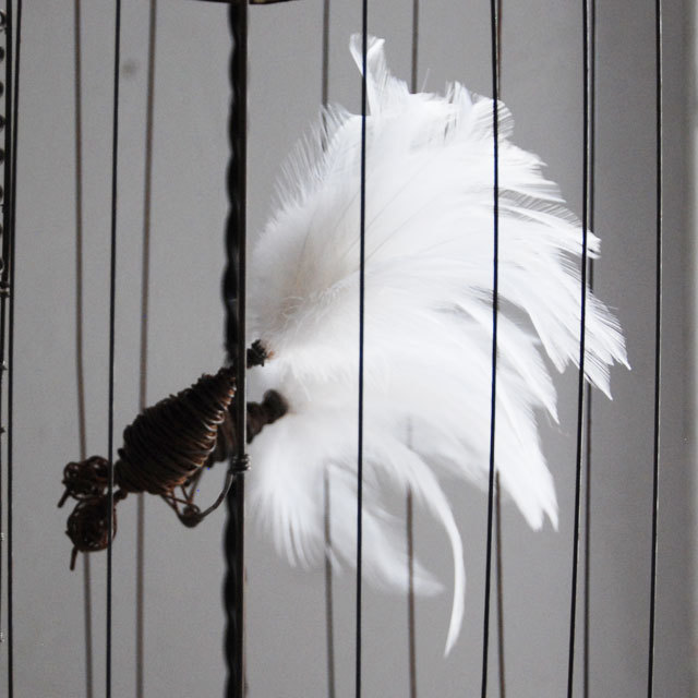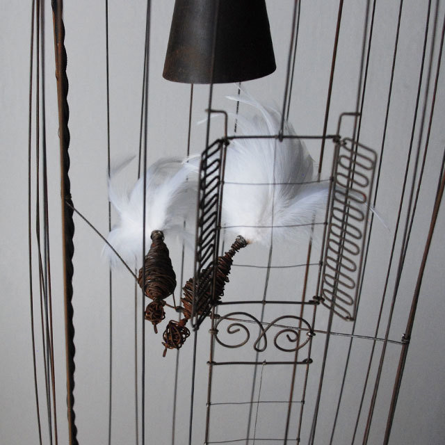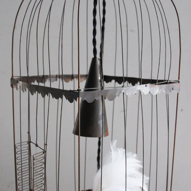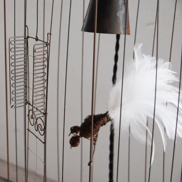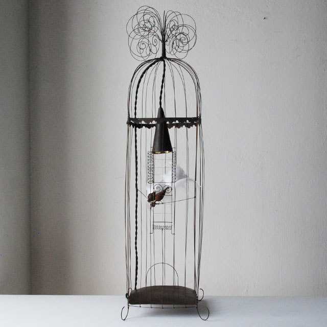 繊細なワイヤーワークの鳥かご。尾羽には実物の羽が使われています。ついじっと見つめていたくなる愛らしい作品です。仲良く並ぶ2羽の鳥たちは、楽しくおしゃべりをしているかのよう。 かごの中のライトが、鳥たちを優しく灯します。