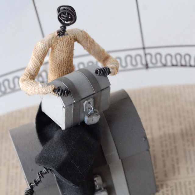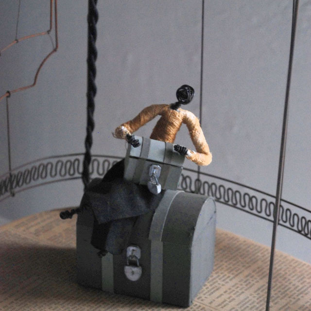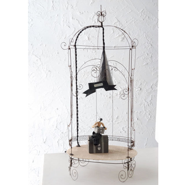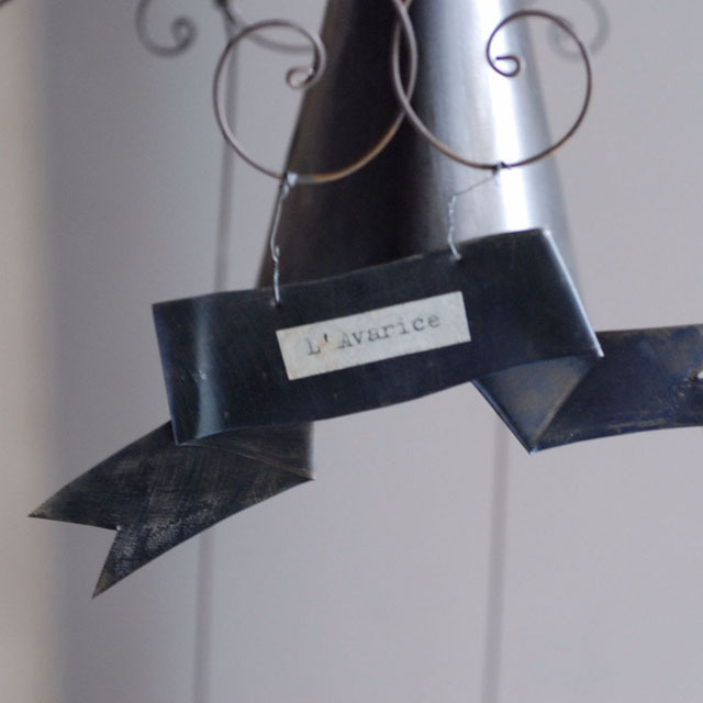 キリスト教「7つの大罪」から'貪欲'をテーマにした作品。ワイヤーと アンティーク生地を組合わせた作品は、どこかポエティックでじっと見入ってしまうほど。中央のライトが、優しく作品を包み込みます。