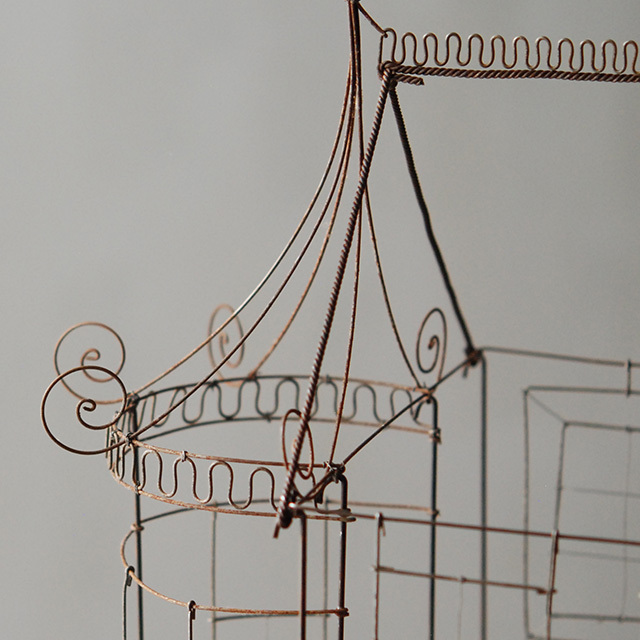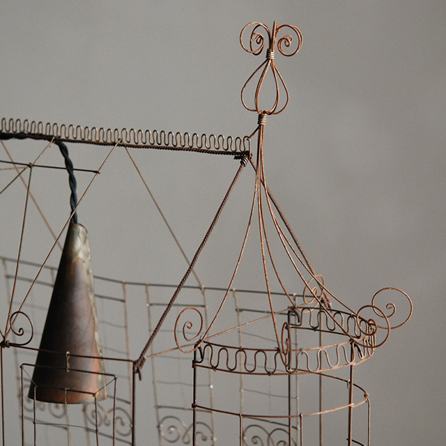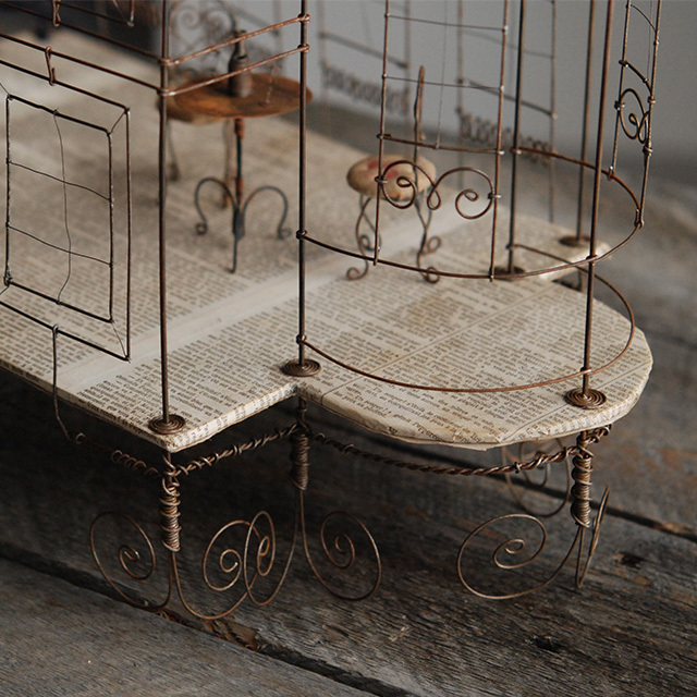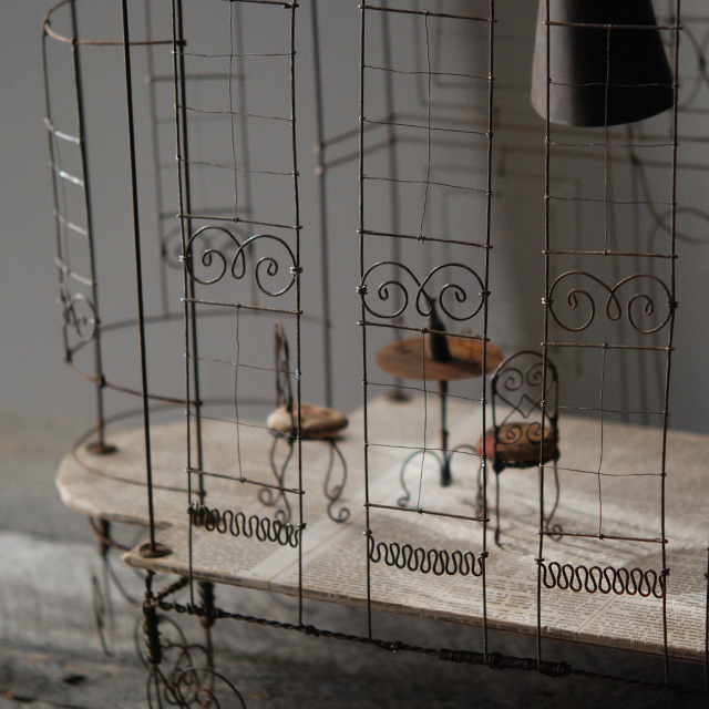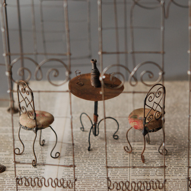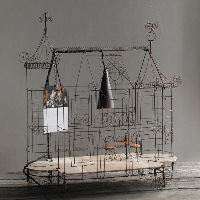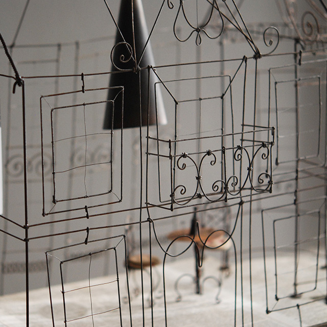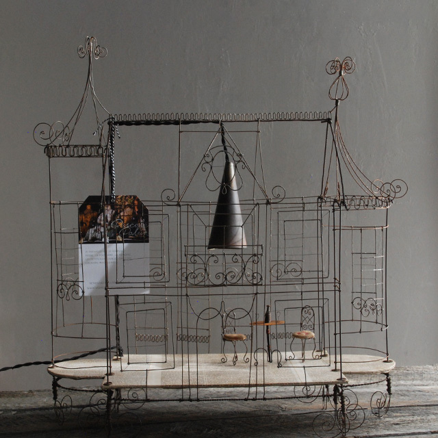 ワイヤーとアンティーク生地を組合わせた作品は、どこかポエティックでじっと見入ってしまうほど。中央のライトが、優しく作品を包み込みます。
