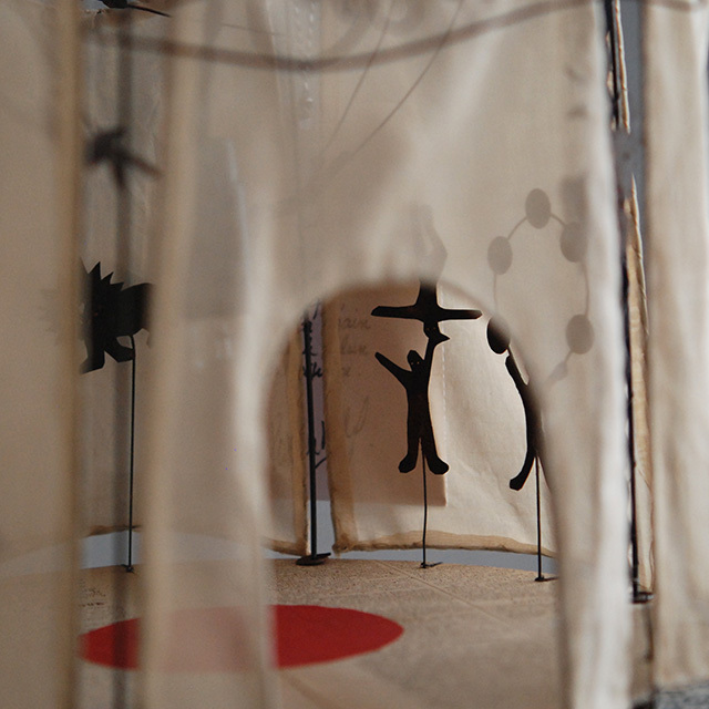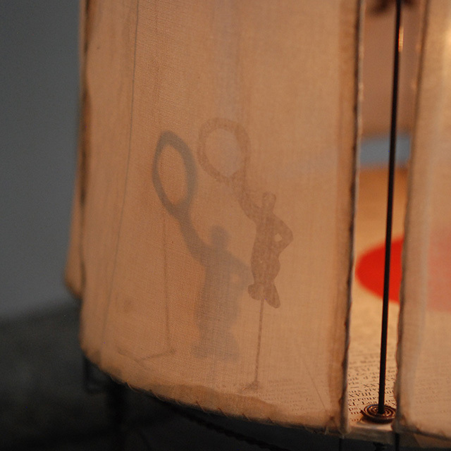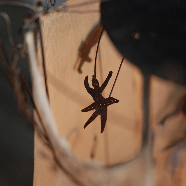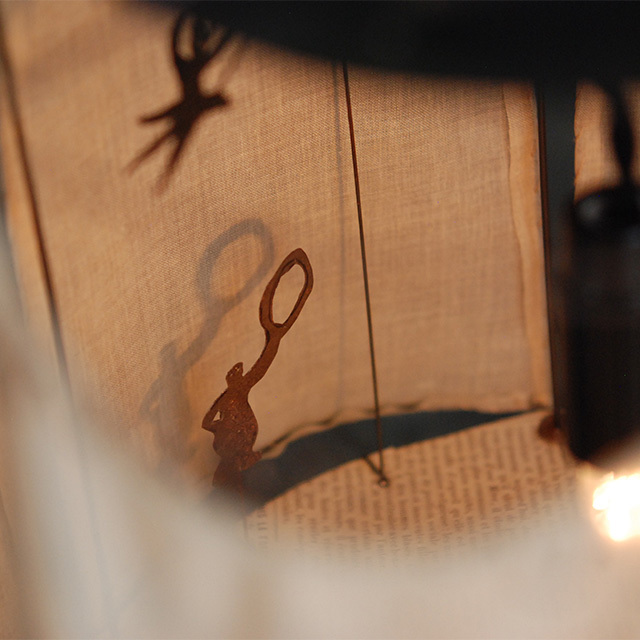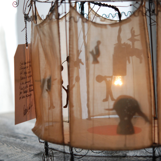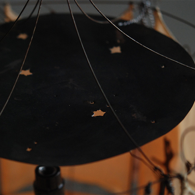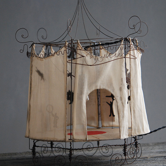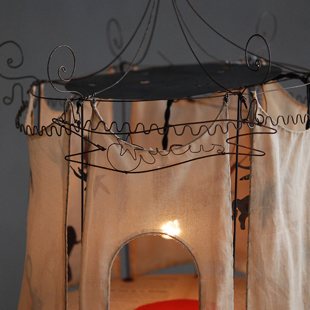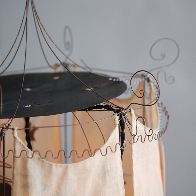 ワイヤーとアンティーク生地を組合わせた作品は、どこかポエティックでじっと見入ってしまうほど。中央のライトが、優しく作品を包み込みます。