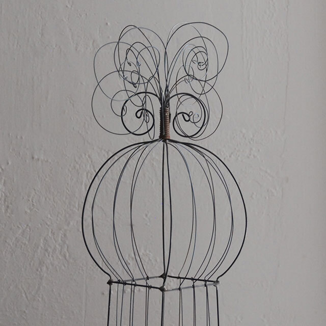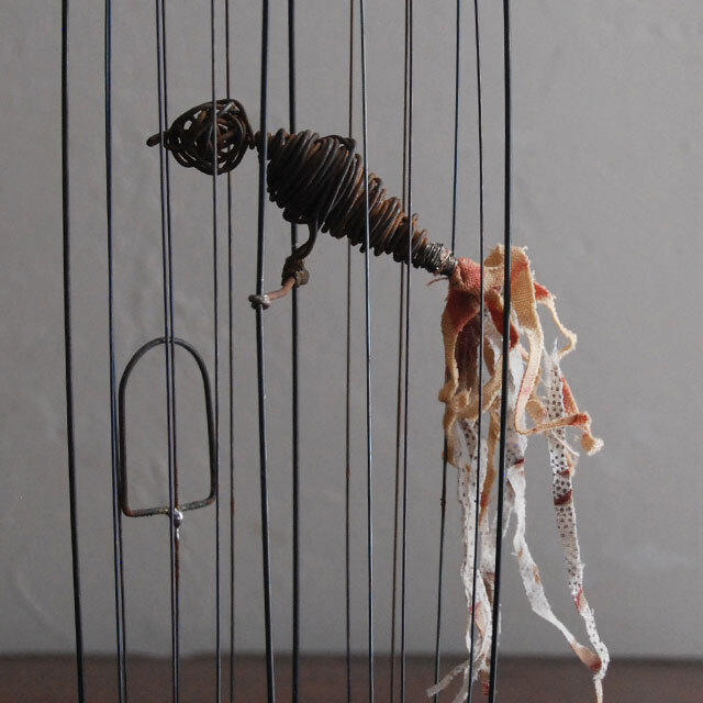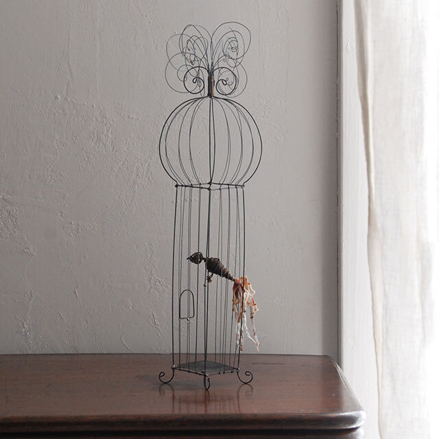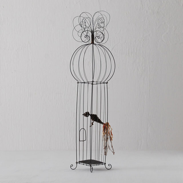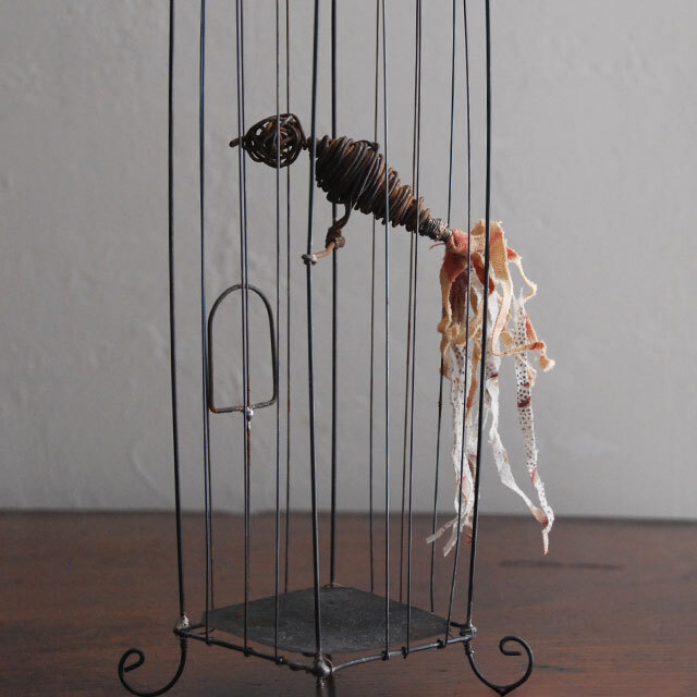 繊細なワイヤーワークの鳥かご。今にも動き出しそうな小鳥の姿。尾羽にはアンティーク生地が使われています。