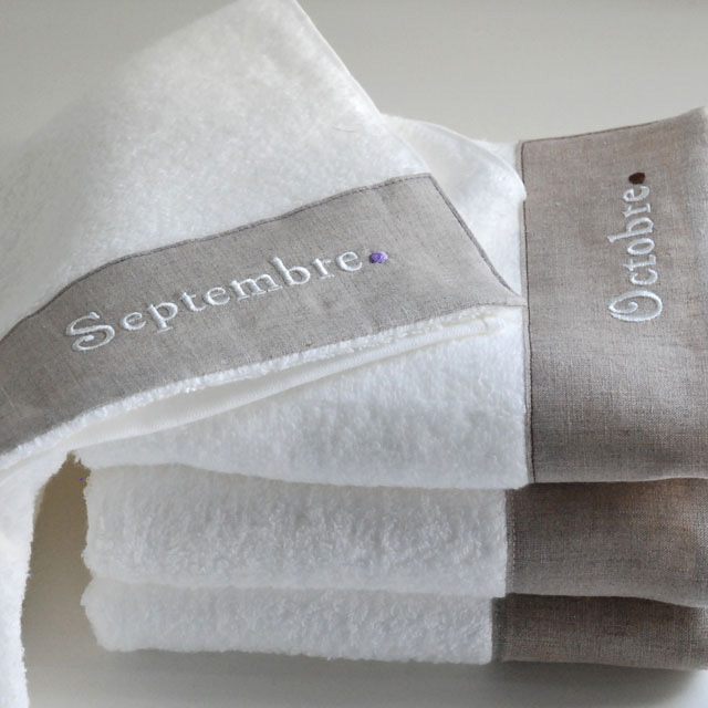 初め、数回洗って頂き余分な毛羽を落としてからお使いください。コーマ糸を使用していますので、風合いの良さが持続します。リネンの生地にフランス語で12ヶ月を刺繍しました。