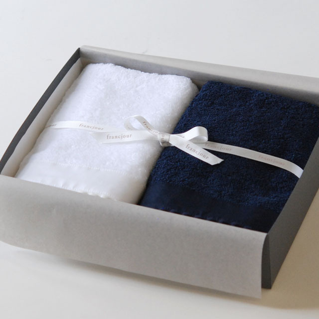 白、ネイビーの配色のタオルにあしらったボンテンブレードが可愛くなりすぎず、ラグジュアリーな仕上がりとなっています。